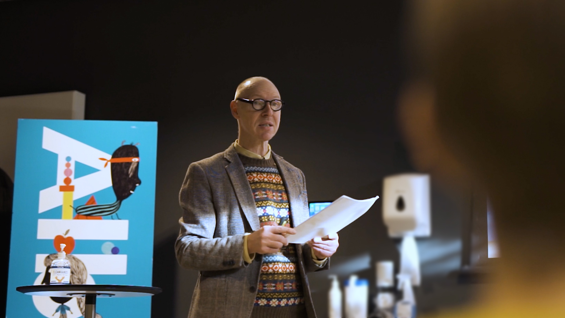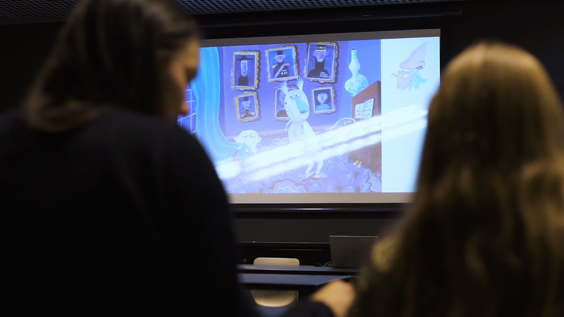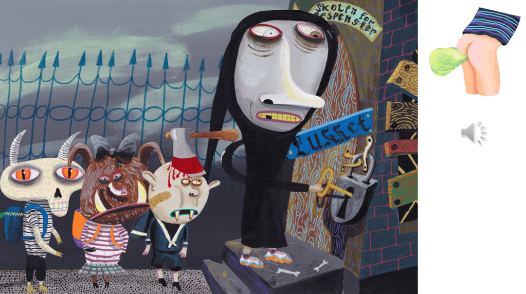 I dokumentet med historien er det markeret med gult, hver gang formidleren skal skifte slide på PowerPoint-showet. Når der skiftes slide, aktiveres den aktuelle lyd.